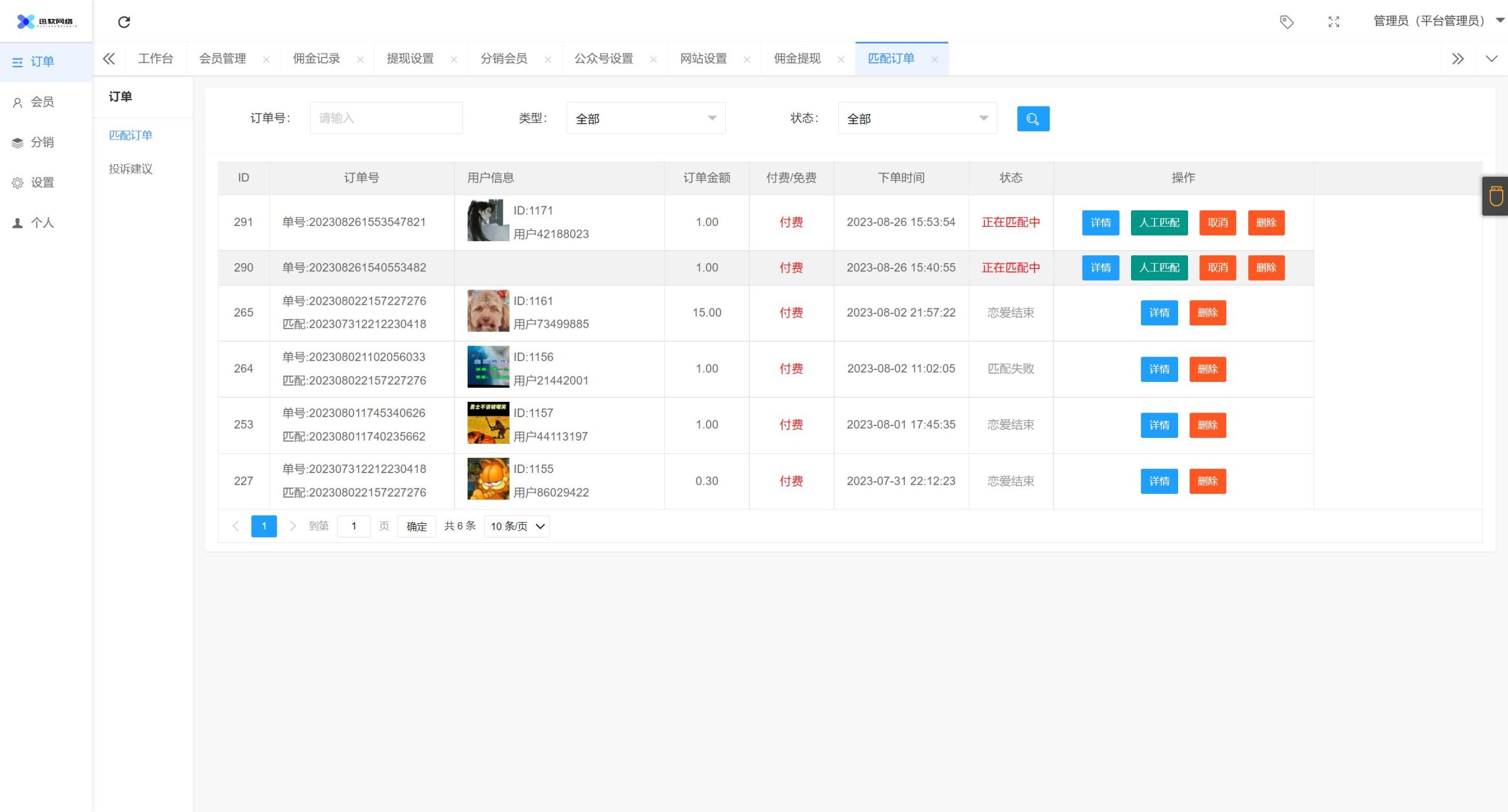 5. 多种匹配方式:后台支持多种匹配方式,当用户数量增多之后,可以自动匹配,方便快捷。